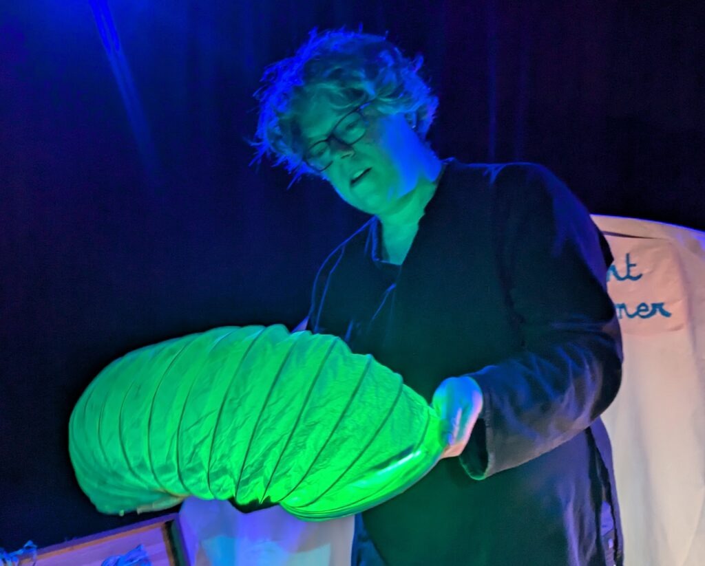 Accompagné.e de la musicienne Mariane Berthault, iel parcourra divers paysages (plages, mer, abysses) et rencontrera une mer – une mère ?- déchainée, une baleine unique en son genre et des animaux sous-marins aux sons et lumières apaisants.